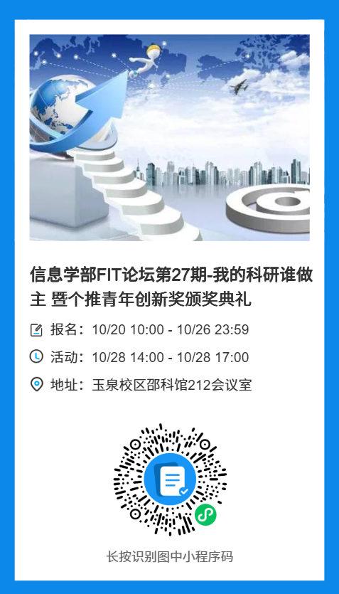 经研究决定,信息学部FIT论坛第27期定于2025年10月28日(下周二)下午14:00在玉泉校区邵科馆212会议室举行。会议议程如下: